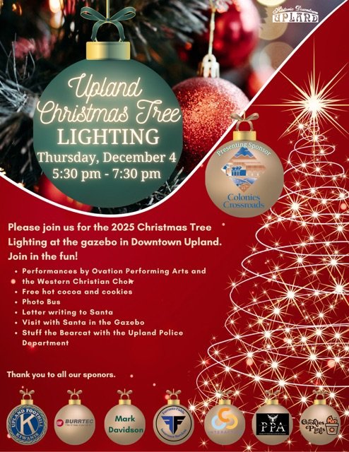 Join us for Upland’s Christmas Tree Lighting on Thursday, December 4th at 5:30 PM at the downtown gazebo (9th Street & 2nd Avenue).